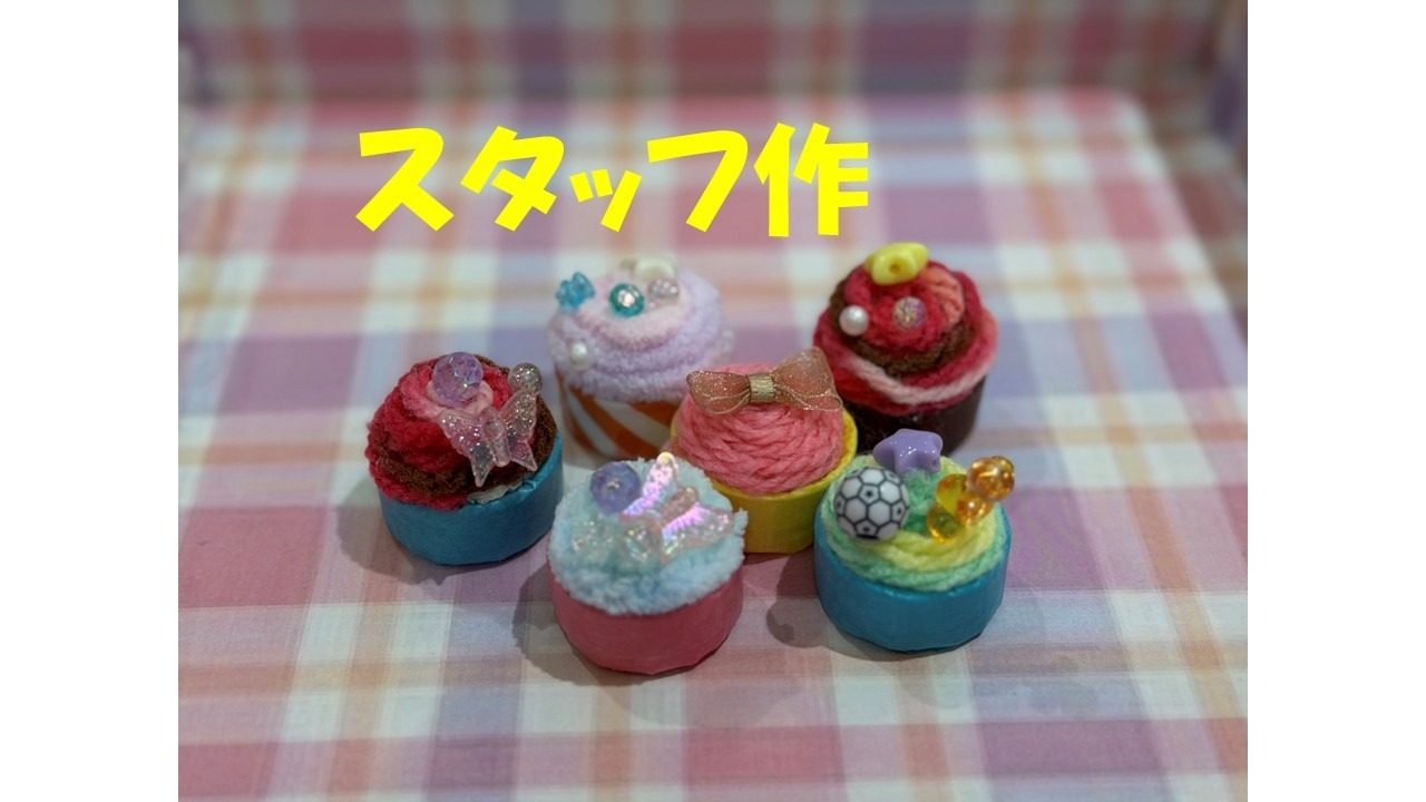 用意してあるカップにお好みの毛糸とビーズをのせるだけでかわいいカップケーキの出来上がりですっ💓