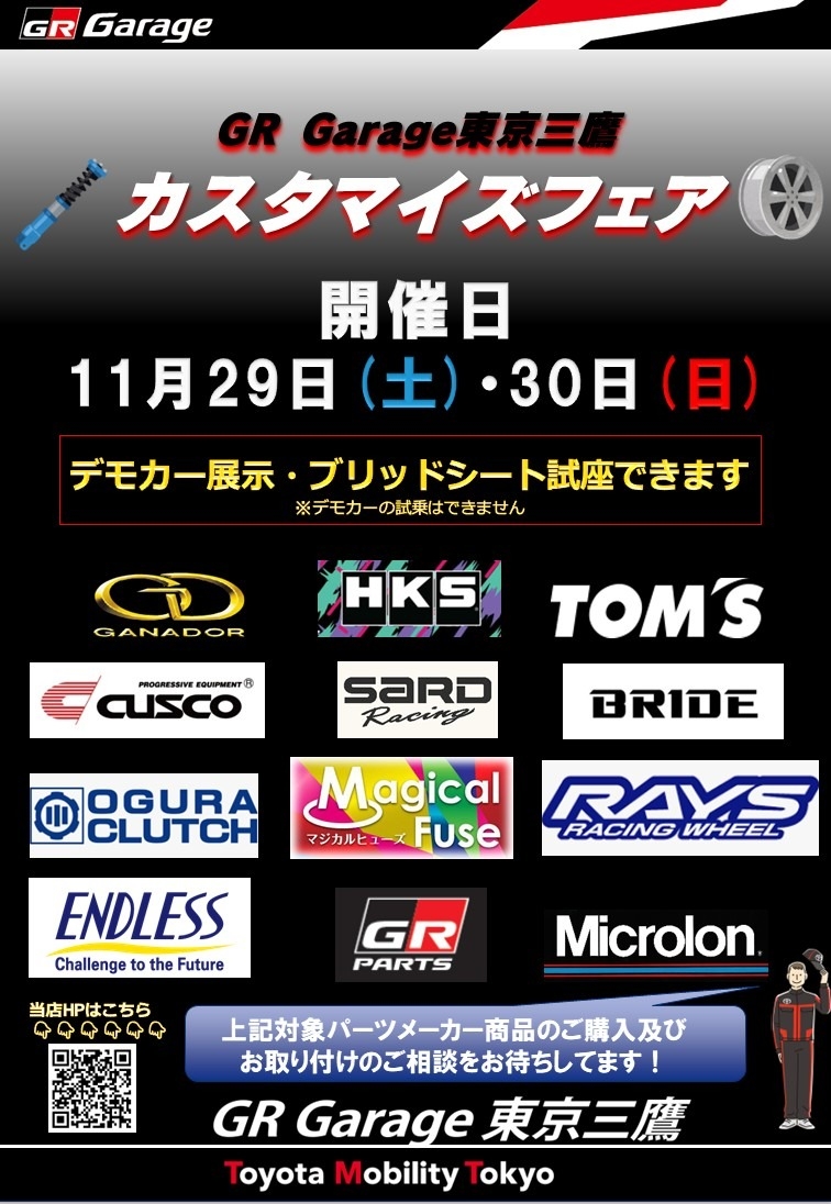 11月29日(土)・30日(日)に、GR Garage東京三鷹にてカスタマイズフェアを開催いたします。