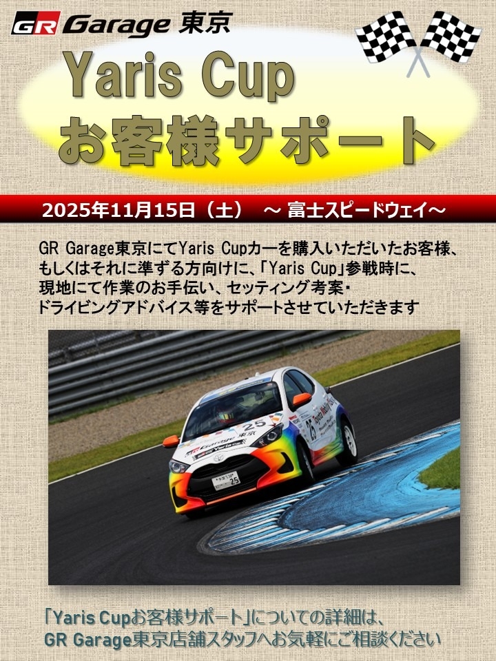 「Yaris Cupお客様サポート」についての詳細は、GR Garage東京店舗スタッフへ
