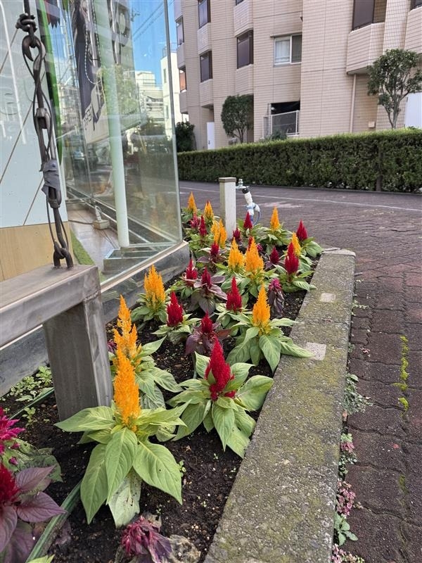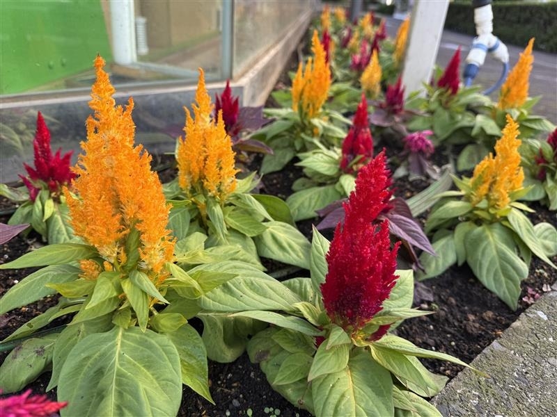 10月から新たに『ケイトウ』にお花が替わり、赤と黄色のケイトウがまるで炎が燃えるような形状でそれぞれ色鮮やかに咲いております。