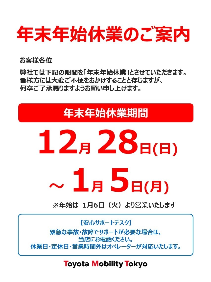緊急の対応や故障でサポートが必要な場合、「年末年始休業」期間は安心サポートデスクの