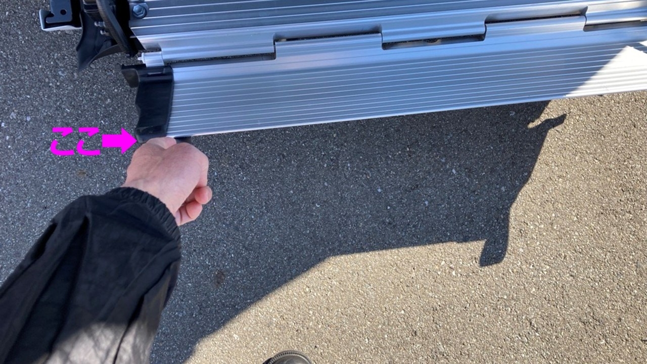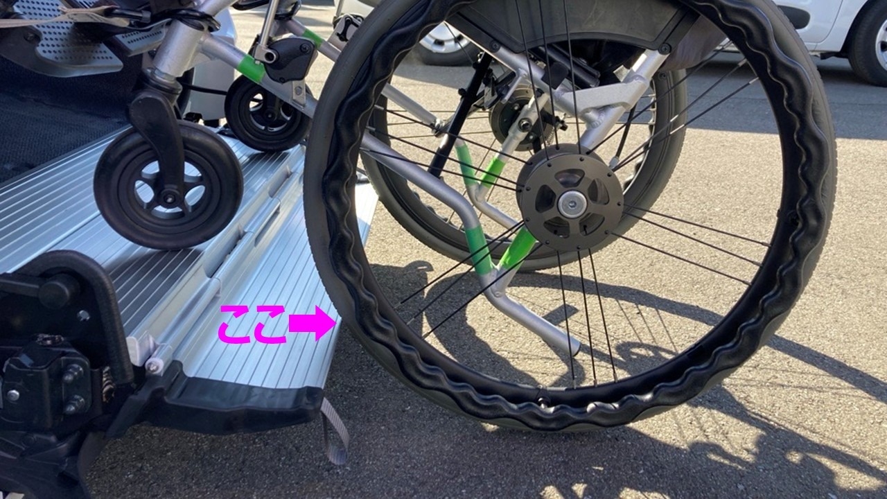 前輪をスロープ上段に乗せ後輪をスロープ下段の先端に