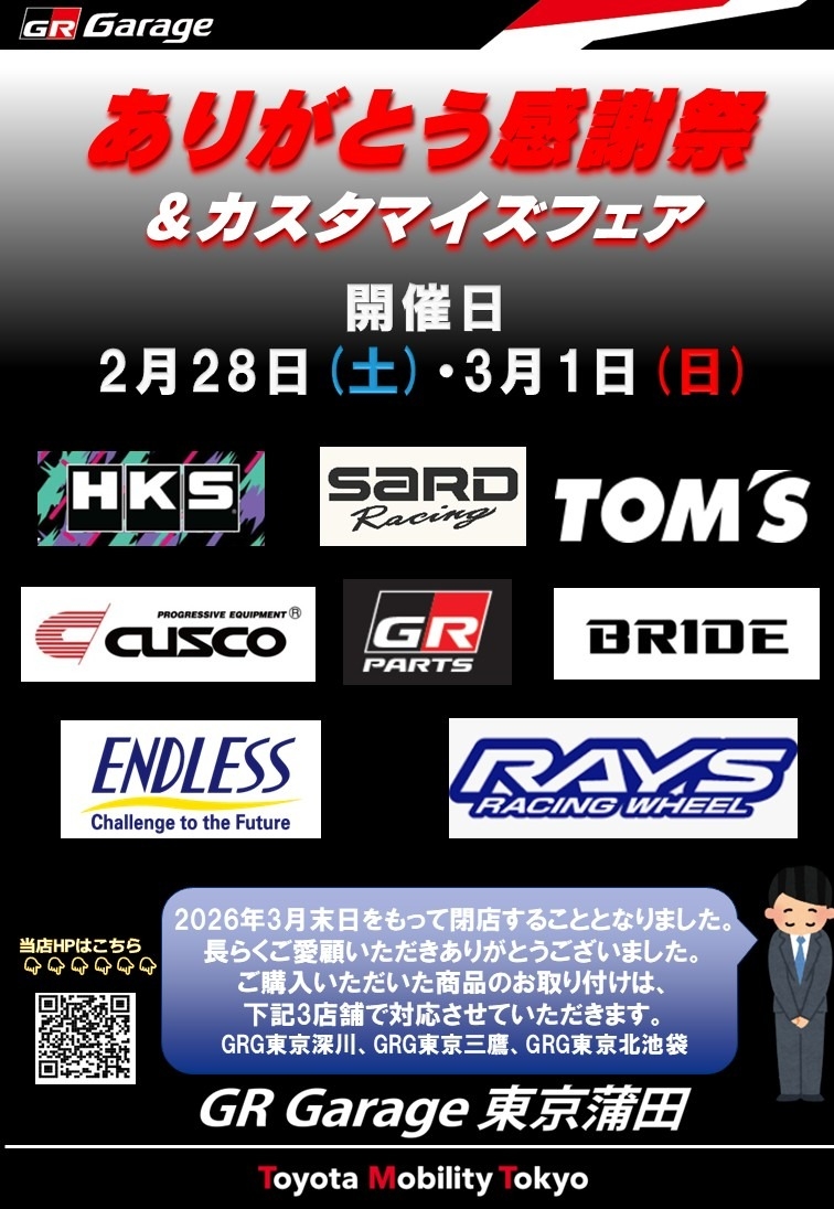 GR Garage東京蒲田は、2026年3月末をもって閉店することとなりました。