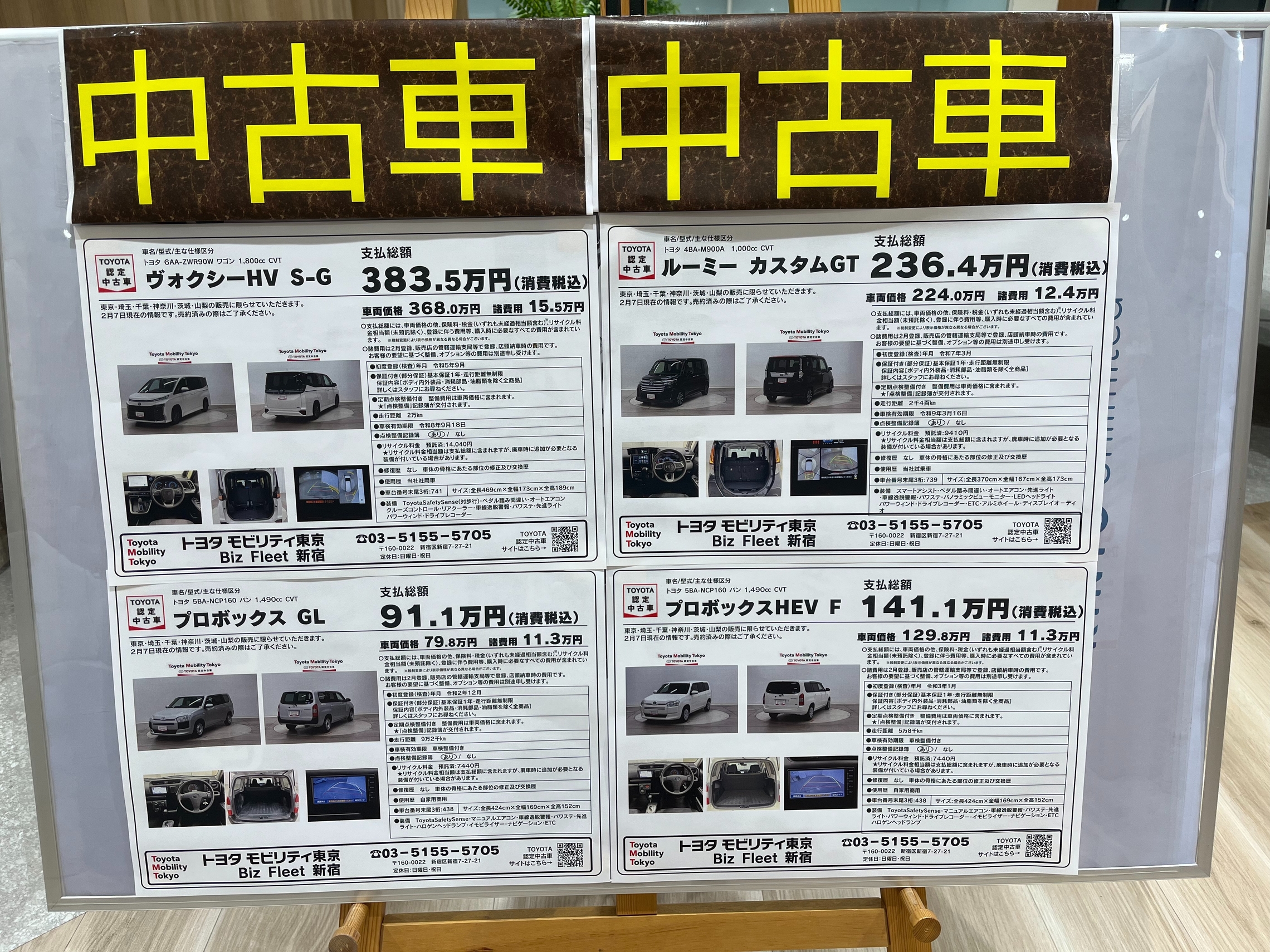 Biz Fleet 新宿 中古車フェア開催中!! 2026.02.07 皆さま、こんにちは! いつもBiz Fleet 新宿のブログをご覧いただきありがとうございます。 2/7㈯~14㈯まで中古車フェアを開催しています。 * Biz Fleet 新宿 日曜祝日定休 VOXY、ROOMY、プロボックスなど、トヨタ認定中古車を多数、揃えています。(2/7在庫) 皆さまのご来店をスタッフ一同、心よりお待ちしております☺ 前の記事へ 店舗ブログ一覧に戻る 次の記事へ