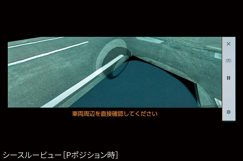 パノラミックビュー/サイドクリアランスビュー/コーナリングビュー表示中に、床下透過映像表示機能がONになっていれば車両直下およびタイヤ付近のアンダーフロア映像を表示して駐車やすり抜けをサポートします。