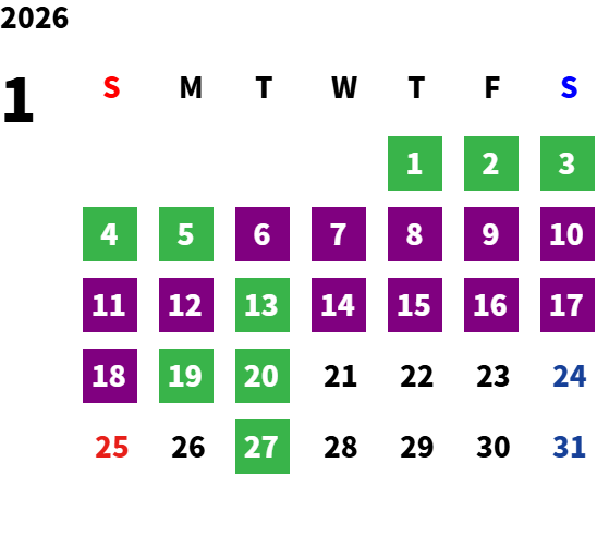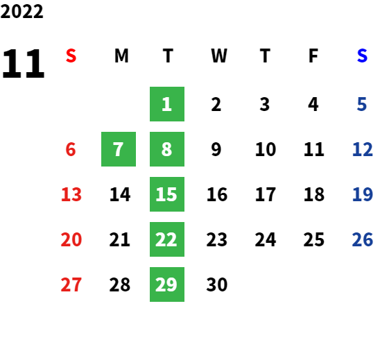 火曜日および第1・第3月曜日、月1回日曜日